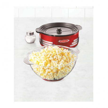 Keep the retro look and add the innovation with this popcorn maker and bowl in one! This unique design with built-in stirring rod moves the popcorn through the oil preventing the popcorn from burning, while the clear dome doubles as a serving bowl. Simply add oil, salt, and popcorn kernels and in about five minutes you will have a perfect batch of delicious popcorn. Also, works great with Nostalgia Pre-Measured Pouches!