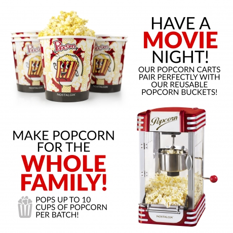 - MOVIE THEATER POPCORN AT HOME: Whether it's movie night or snack time, this cart pops up to 10 cups of movie theater-style popcorn per batch to keep popcorn buckets full