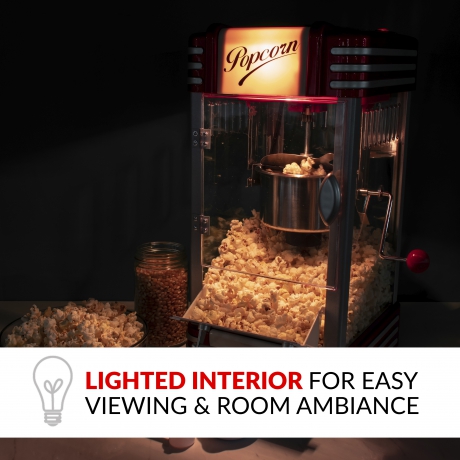 - LIGHTED INTERIOR: Lighted interior creates a fun and pleasant room ambiance and 360-degree clear view popping chamber allows you to watch your popcorn pop