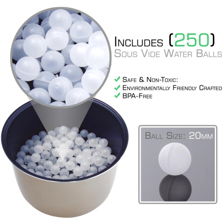 Get consistent temperature while saving electricity with the addition of these Premium Sous Vide Water Balls from NutriChef. Minimize water evaporation and heat loss without ever having to use a lid! The sous vide balls conform to any container, providing a layer of protection. Use with any pot, food container or receptacle that can hold a sous vide bath.