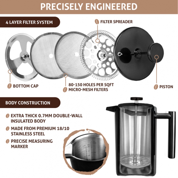DOUBLE WALL INSULATION Equipped with an insulated double wall body, your coffee or tea will be able to stay fresh for a long time! Brew your coffee the way YOU want it. Contains measuring markers inside to ensure a precise and flavorful pour each time..DURABLE 18/10 STAINL.