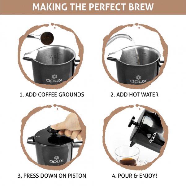 - OPUX French Press is the perfect homebrewing solution for anyone needing their daily dose of caffeine to get them through the workday! This coffee maker is equipped with the following features that will enhance the coffee drinking experience: