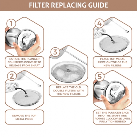 - 4 LEVEL FILTER SYSTEM 4 Level Filter Screen System makes sure not even the tiniest of coffee grounds reach your cup. Our micro-mesh filters consist of 80-150 holes per sq ft, enabling full separation of coffee grounds from the beverage, allowing coffee to fully steep and giving your daily cup of joe a bold and full-bodied flavor.