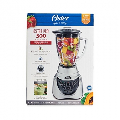 Pre-programmed smart settings for more control; Dual Direction Blade Technology chops and grinds food with ease; Oster 500 Blender handles tough foods like nuts; Use to combine your favorite fruits and veggies into tasty smoothies; Good for making milkshakes, blended cocktails and more; All Metal Drive for long-lasting durability; Modern soft-touch buttons; 6-cup glass jar; Premium brushed-nickel finish