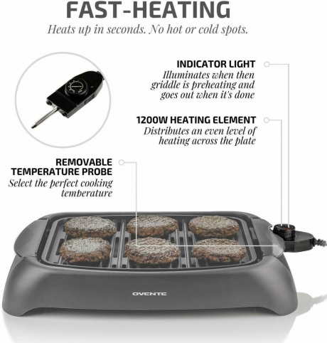 With Ovente’s thermostat controlled, non-stick indoor grill, you can sear bacon, fish, steaks, potatoes, sausages, and patties packed amazing flavor, tenderness, and beautiful grill marks!