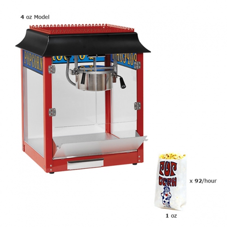 Designed to look like carnival popcorn makers of old. This retro popcorn machine has modern capabilities - pops 4-ounces in a few minutes, and over 18 cups in an hour. It's easy to fill and clean with side-hinged anodized aluminum kettle, and a stainless steel interior. It has the highest possible heat transfer for very few un-popped kernels. Heated showcase is lighted and keeps popcorn hot and fresh for hours.