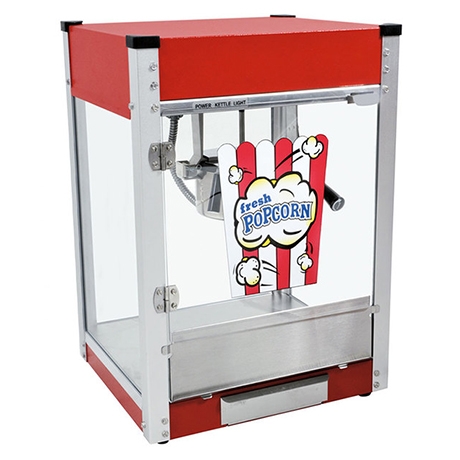 Create delicious flavored popcorn for your hungry customers with the Paragon 1104800 Cineplex red 4 oz. popcorn machine! This popcorn machine produces up to 92 one oz. portions per hour for maximum output, and its kettle is made of anodized aluminum for long-lasting durability. The kettle is designed for easy use and dumping, and the stainless steel food zone underneath catches finished popcorn so you can quickly scoop it into boxes or bags for sale. Tempered glass allows a full view of the interior without sacrificing durability, and its red top is sure to catch your customers' attention.