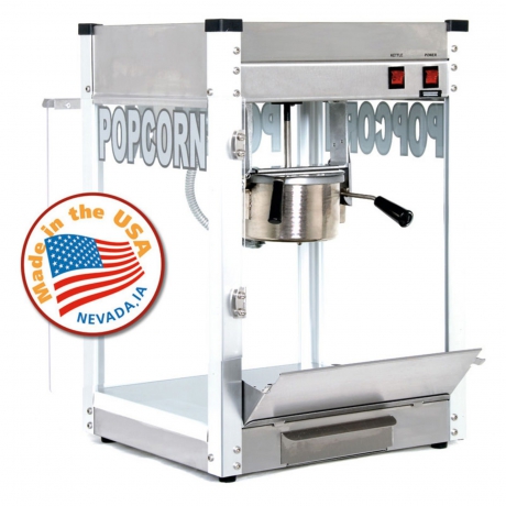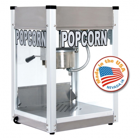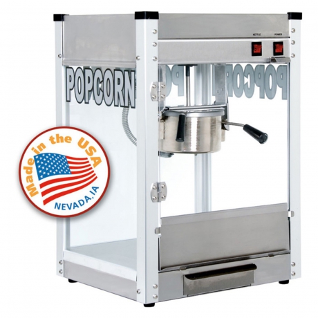 Pops (92) 1-ounce servings per hour.High-output hard-coat anodized aluminum kettle.Simply rotate handle to the right to release.Heavy-duty gear motor; all metal gears.Durable cabinet with stainless steel foodzone, tempered glass panels, and presentation lamp.Made in the USA.