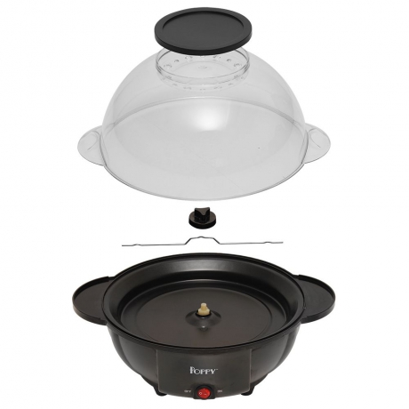 120V, 60Hz, 850W Stirring rod rotates to make sure virtually every kernel pops Produces 6 quarts of hot, freshly buttered popcorn in about 5 minutes Lid doubles as handy popcorn serving bowl Stirring rod easily removed for cleanup Nonstick surface of the base wipes clean with a cloth