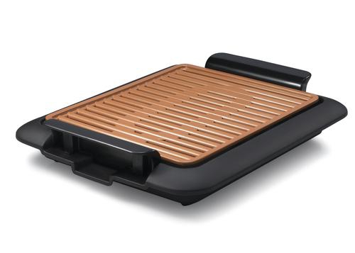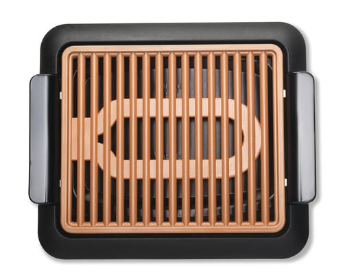Non Stick Slick Ceramic Coating.Cooling Drip Pan So Smoke can't Form.The Smokeless Secret is a Heated Grilling Grate.Perfect Even Heat.Dishwasher Safe.Ti-Cerama Surface with Super Strong Titanium won’t Scratch.