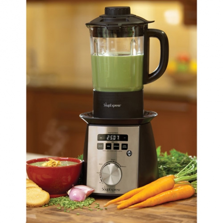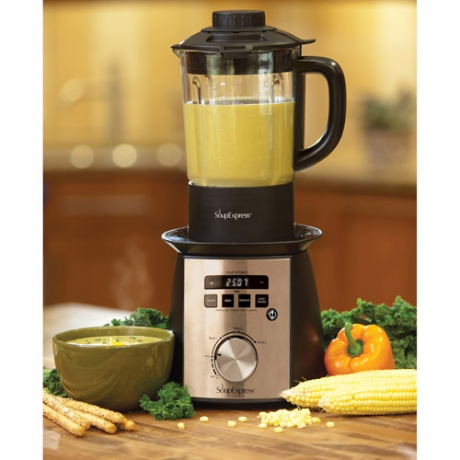 The SoupExpress 3-Speed Blender is a multi-purpose kitchen appliance. With the four-blade cutting system, you can easily make bread crumbs, chop nuts and dice vegetables. Blending smoothies and making sauce is easy using this black and stainless steel blender. In addition, the BPA-free blender has three cook settings. Make tasty homemade soup in a snap using this handy appliance. The temperature controls correspond to different degrees of stove heat, allowing you to simmer, saute and boil. The SoupExpress 3-Speed Blender is great for kitchenettes, offices and other places where access to a stove is limited. There are innumerable combinations of ingredients and techniques to create many types of foods with this blender. This blender and soup maker also has a timer.