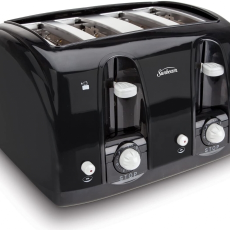 The Sunbeam 4-Slice Toaster uses electronic toasting-technology for uniformly toasted bread, bagels, English muffins and more, just the way you like. With dual controls on each side of the toaster, you can choose two different settings to simultaneously toast to different shades of browning. This 4-slice toaster also includes other features that make toasting easy and convenient, like extra-wide slots, a bagel-select button for toasting bagels, toast-lift to elevate toasted slices and a 'Cancel' button to immediately stop toasting.