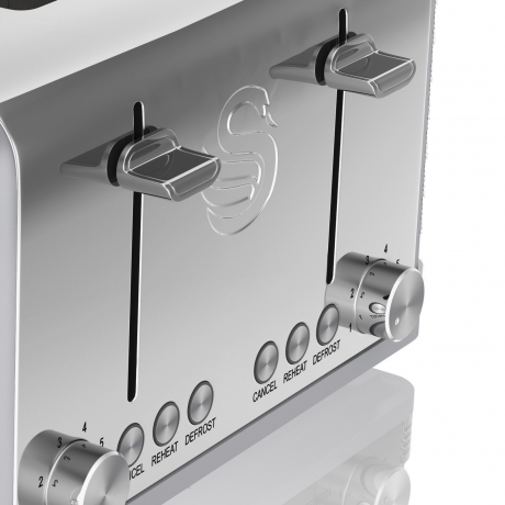 | • Cancel, Defrost and Reheat functions • Auto-centring and electronic browning control • Adjustable knob for 6 levels of browning • Cord storage and transparent push knob • Red LED Indicator lights • Slide out crumb tray, high lift and cool-touch walls |