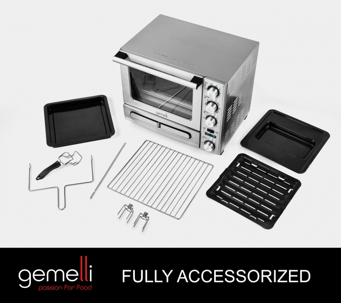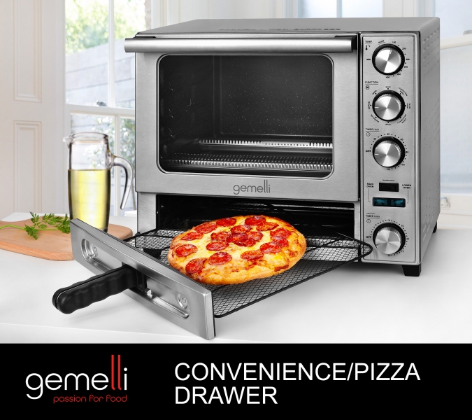 The Gemelli Twin Oven takes the everyday functionality of a professional grade countertop convection oven and adds a rotisserie feature - for healthy cooking; along with the convenience of a separate lower oven, with built-in pizza drawer - for fast meal preparation. The main oven features a combination of infrared and 4 quartz heating elements to provide fast and optimum temperatures (up to 450º) for cooking and baking. Plus, the rotisserie feature allows you to cook a variety of healthy and flavorful meats (up to 5-6 lbs evenly) while unwanted fats drip away. The bottom oven is specially designed for cooking 12" pizzas, quesadillas, toasting bread, bagels, frozen snacks and more... without the need for an extra sheet pan. The simple knob controls, timer, non-stick coating, and elegant stainless steel finish - Makes the Gemelli Twin Oven easy to use, easy to maintain, and durable enough to last for years to come.
