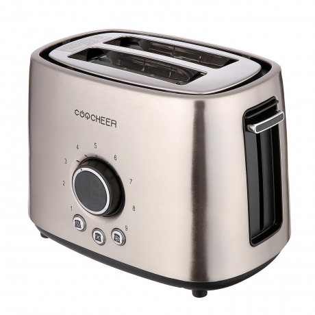 Toaster with 2 Extra wide self-adjusting slots(1.5" ).9 Adjustable brownin g controls.Reheat, Defrost, and Cancel Buttons.Stainless Steel Toaster with horizontal brush line.Toaster with LCD Digital display setting.Easy to clean (slide out cru.
