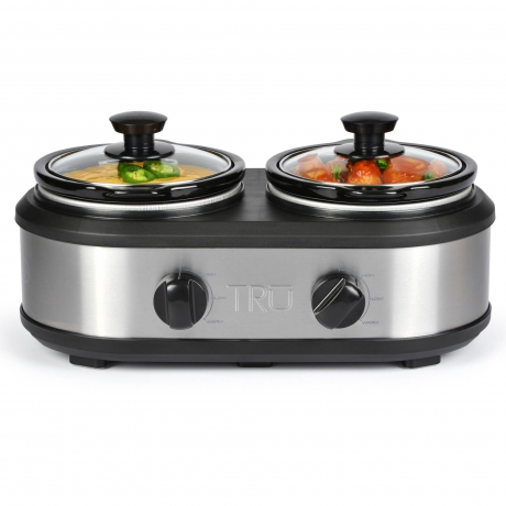 TRU 1.25-Quart Double- Crock Slow Cooker Buffet:Two 1.25 quart round crocks for dual cookingRemovable stoneware lift easily out of the slow cooker for table-side serving and easy cleaningTempered glass lids make it easy to monitor cooking progressIntegrated side handles allow for safe transport from the countertop to the tableIndependent heat controls allows for full control of cooking temperatures for each crock