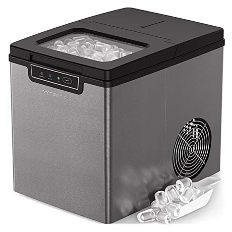 With the Vremi Portable Countertop Ice Maker, you?ll never run out of ice when you need it. Our energy-efficient compact ice making machine keeps parties and family dinners alive with ice whenever and wherever you need it. In just 8 to 10 minutes, you?ll have smooth, bullet-shaped ice that makes any drink cooler. We make ice easy; with our ice maker, there?s no complex installation to worry about and our automatic shut-off function and warning lights helps stop problems before they start. With a new, easy-to-use control panel and a modern silver and black finish, it?s perfect for kitchens, an rv, boats, bars, patios and more! Your drinks will be cool and your gatherings chill. Enjoy easy, breezy, and freezy fun with the Vremi Countertop Ice Maker.Product Details & Features:Ice maker size: 9.5 x 12 x 13.5 inchesWeight: 23.6 lbsMaterial: ABS Plastic interior, Stainless Steel exteriorWater reservoir capacity: 2.2 litersIce production: 26 lbs of ice in 24 hoursIce basket capacity: 1.5 lbsIce time: Ready in 8 to 10 minutesPower: 120W / 115V>Smooth bullet-shaped ice cubesAuto shut off when ice is fullWarning lights when water needs to be refilledEasy to fill and drain water quicklySimple-to-use control panelComes with small ice scoop and removable ice basketCertifications: WaterSense, ETL, FDA CertifiedIMPORTANT THINGS TO KNOW:f the machine has been in any other position than upright, leave it upright for 24 hours for the coolant to settleWash the tray and scoop in warm soapy water before usingFor full instructions and safety warnings, always refer to Vremi product box or manual.