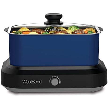 West Bend Versatility Cooker, 5-Quart Capacity, Model 87905B, Slow Cooker, Oven-Ready Toaster, Stovetop Pot, Electric Griddle, Blue