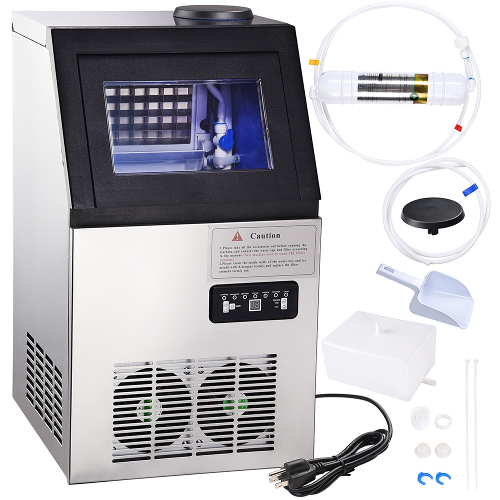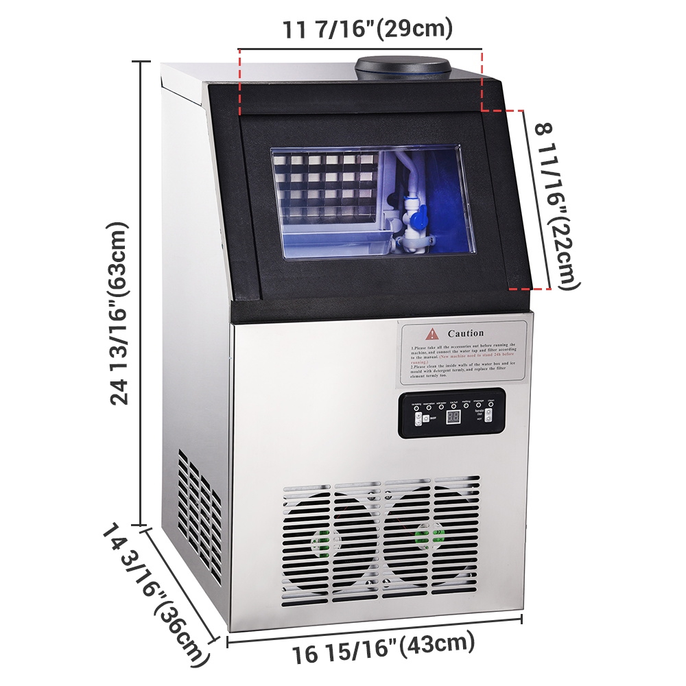 Features:- Portable: Countertop design commercial ice maker machine- High Efficiency: Produces almost 100 lbs. of ice per day at 10C,22 lbs storage- Large Storage Capacity: Can store 45 pieces ice per ice cube tray- LCD Display Control Panel: Shows current status, timer, standby and refill alarm- Light Indicator: When it is short of water or ice bucket is full, you'll be alerted- Auto Shut Off: Automatically shuts off when ice is full- Durable Features:- Portable: Countertop design commercial ice maker machine- High Efficiency: Produces almost 100 lbs. of ice per 24 hours when surrounding temperature is 10C- Large Storage Capacity: Can store 45 pieces ice per ice cube tray- Two ways of Water Intake: Connecting with water faucet & barreled water attaching on the top hole- LCD Display Control Panel: Shows current status, timer, standby and refill alarm- Light Indicator: When it is short of water or ice bucket is full, you'll be alerted- Auto Shut Off: Automatically shuts off when ice is full- Timer Function: Set the countdown time for the ice making procedure (5 min to 50 min); Auto startup/countdown time (in hours)- Clear Viewing Window & Built-in Blue Light: Ice level checking & Easy monitoring- Dual Built-in Exhaust Fan: Ensures good heat dissipation- Durable Design: Made of dependable stainless steel material- Drainage System: With drain hose and tank- Low-maintenance: Automatic self-cleaning function for convenience- Application: Suitable for home, restaurants, bars, hotels, and moreSpecifications:- Material: Stainless Steel- Voltage: 110V 60Hz- Power: 300W- Daily Ice Making Capacity: nearly 100 lbs (45 kg) at 10C; 77 lbs (35 kg) at 25C- Ice Making Speed: 17 min first time (including pre-cooling time); 10-20min (adjusted according to demand)- Refrigerant: R1347A- Certification: UL Listed power cord & plug- Storage: 22 lbs (10 kg)- Overall Dimension (LxWxH): 16 15/16" x 14 3/16" x 24 13/16" (43 x 36 x 63 cm)Package Contents:- 1x Ice Maker Machine- 1x Ice Scoop- 1x Drain Hose- 1x PP Cotton Filter- 1x Water Tank- 1x ManualNote:- Connecting with water faucet, ice maker starts working when both faucet and machine are turned on. No need turning off the faucet, the ice maker will continue making ice unless ice is full.- If faucet is turned off and the ice maker fails to make ice twice in a row, ice making procedure will stop automatically.- If ice cubes fall and prop the plate up during the ice making procedure, the ice maker will stop operating since system identifies full ice when plate is propped up. In this case, please take out those ice cubes so as to work again.- Specification:Ice Cube Size: 7/8 x 7/8 x 7/8 (2.2 x 2.2 x 2.2 cm).