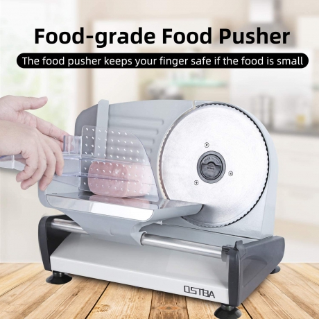 Safety protection: to operate the deli slicer, you must press both the safety lock & power button simultaneously to start, avoid the mistake operation. Non-slip suction cup feet keeps the meat slicer stable during working.