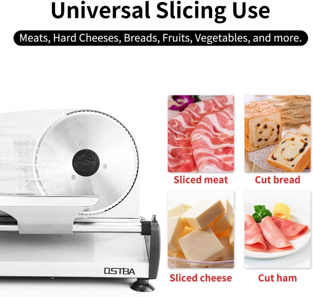 With sleek design food slicer pairs nicely with just about any kitchen decor.It's a simple way to slice your own meats, cheeses, breads, vegetables and fruit quickly and easily at home.It has a specialized curve design that allows for easy slice removal.