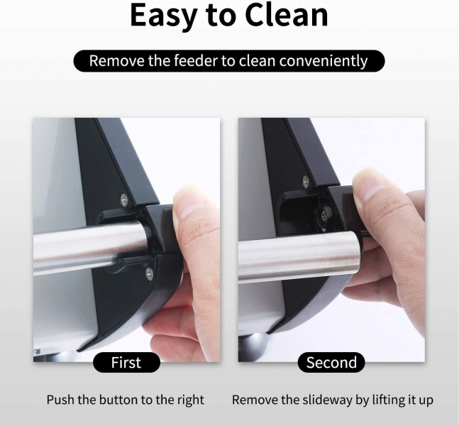 Easy to clean: seamless and removable features make sanitation a breeze. Our removable ring-guard cover prevents debris buildup on cutting surfaces. The blade, food carriage, slide-rod extension and food pusher are removable, it allows for thorough cleaning and sanitation.